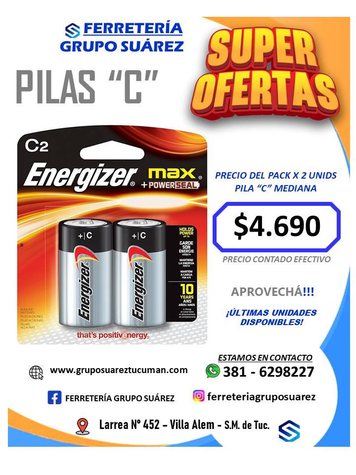 2 x Pilas Alcalinas Tipo C / Mediana / E93 / LR14 / AM2 marca ENERGIZER (Original) de 1.5V.
